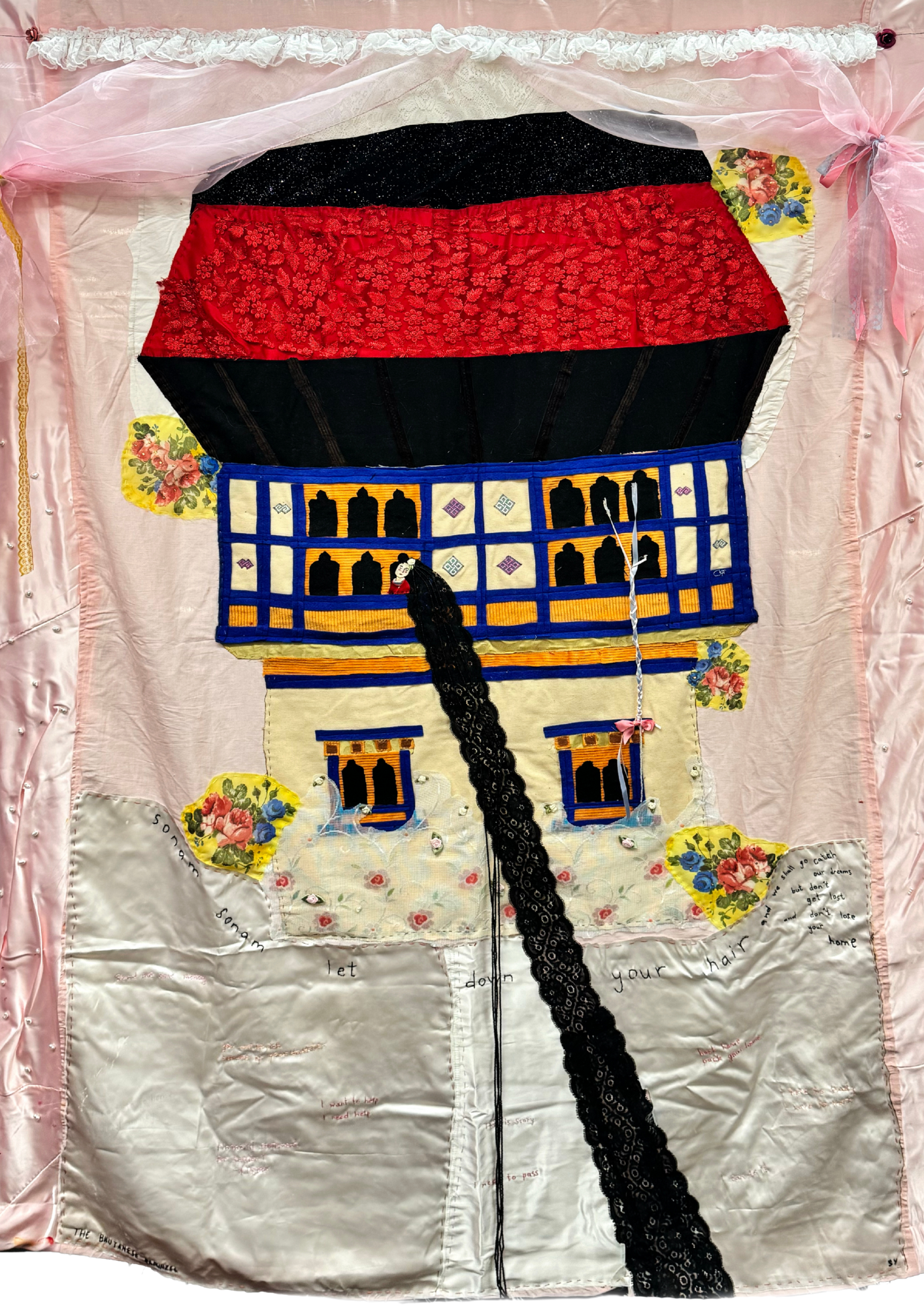 Like Rapunzel, the figure in my artwork uses her hair to escape, a powerful metaphor for her desire for freedom and self-discovery. The night sky represents dreams, while her flowing hair intertwines with the phrase, ‘Sonam, Sonam, let down your hair and we shall go catch our dreams but don’t get lost and don’t lose your home,’ symbolising the struggles endured in pursuit of these aspirations.