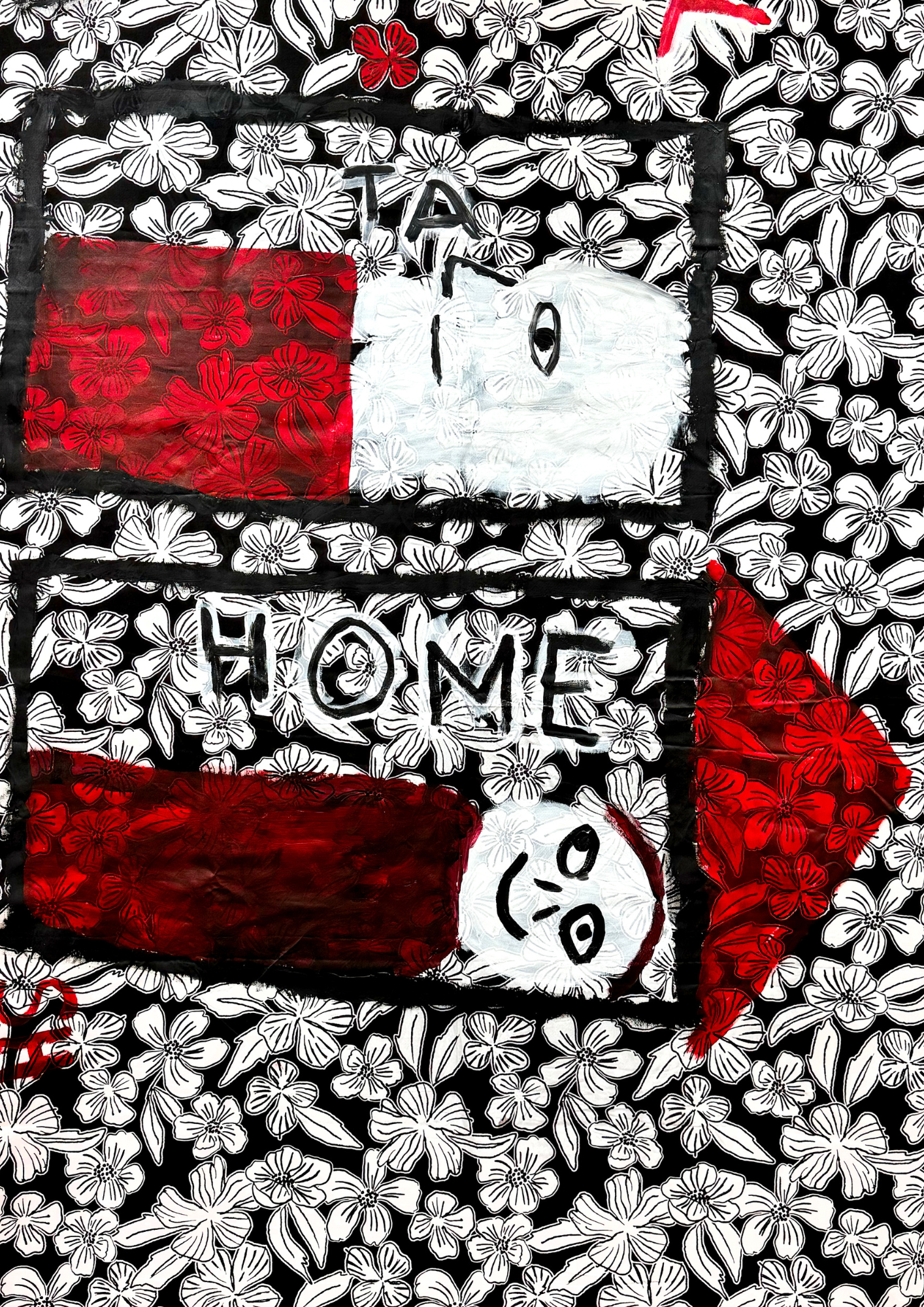 I love the flowers on the fabric. I picked that fabric because it lightened my mood. I wanted to paint something black, white and red because I wanted to do something bold. The lightweight fabric was happenstance and wasn’t chosen deliberately. Likewise, the single red flower falling from the tree was an accidental inclusion when I overbalanced, and the paintbrush luckily fell onto a flower.