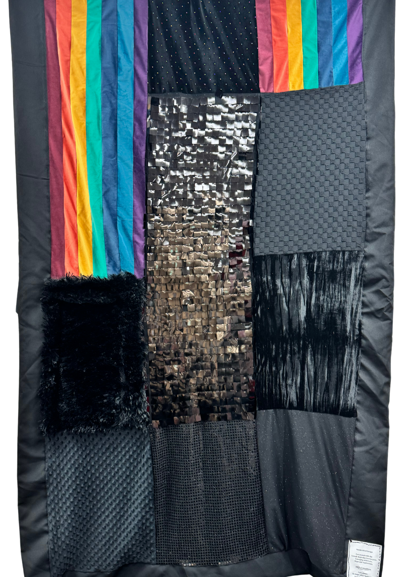 I’m a tactile person, who engages through energy and vibration with the environment and my surroundings, like nature and animals, not people, and that is why my artwork has different fabrics that give different sensory experiences when touched. The black fabric represents the traumatic episodes of my life, this is where I learnt to exist – in the dark, in the shadows and in silence. Not always my choice to be alive, but the hope in me was real, I always wanted a future! I dreamed it to be amazing! And so, in my artwork the rainbows represent joy, happiness and dreaming about what you don’t have as this brings comfort and hope to my life.