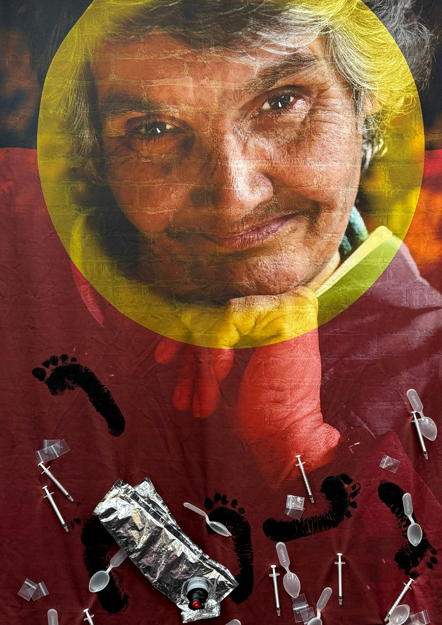 ‘I made the flag big ‘cause I am proud to be Aboriginal, proud to know that I’m part of the Aboriginal community. It’s about having a place and belonging. I am a Wailwan and Wiradjuri woman with disability and I was homeless for over thirty years of my life. I am now housed, but after all this time the streeties are still my community. We all come from the same hardship, the hard streets. And they understand me and I understand them. They don’t judge you for what you’ve been through. You can see the goonie, it represents drinking. The needles, spoons and little plastic bags are about drugs. You ask me why I still might take drugs from time to time? Because I know what you see when you look at me. I know what you think, and sometimes that is too much for me. People don’t understand that being homeless, being Aboriginal, being on drugs, being an alcoholic, having mental health. It’s all connected as one, as that barrier…