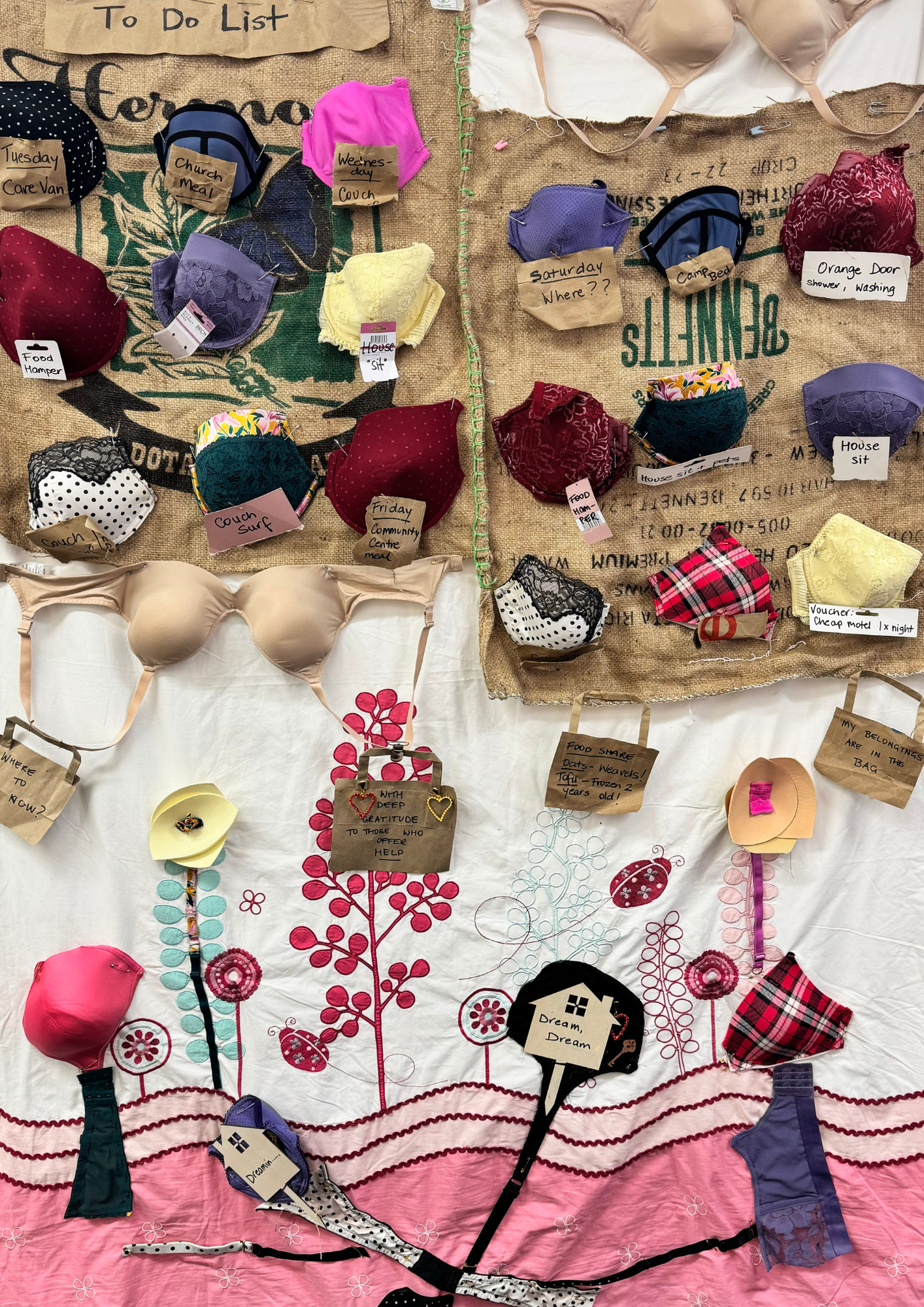 The top half indicates the daily effort required to stay afloat while homeless. The bra cups are set out as a calendar routine with no logical sequence because daily life is a conundrum. Each cup has a reminder note from the To Do List. Bra cups are a symbol for a pouch, a shelter, a container, an empty cup, an empty belly and womanhood. The handbags, made from recycled paper supermarket bags, carry messages reflecting the diverse mix of a day in the life of a homeless female and how food is always an issue during the impermanence of homelessness. Most importantly they hold gratitude for those kind souls who possess the ability to see beyond their own nose. They are some, but not all, women from service provider organisations giving more than their job description – as I have had some bad experiences Others are compassionate strangers, I met through chance encounters.