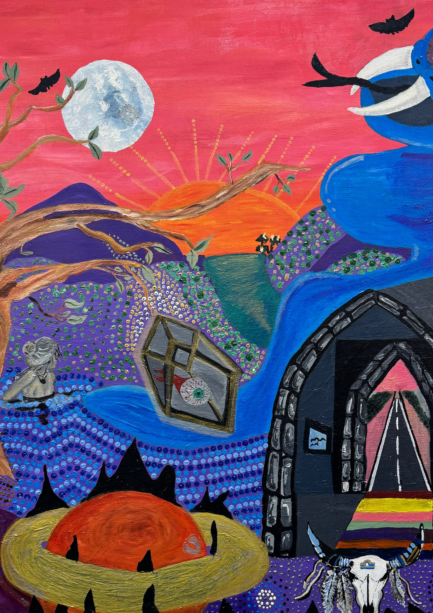And the dots down the bottom symbolise a gathering place, like a cathedral, or a church, or somewhere people can gather and join together. I also used the dotting to add some more texture and vibrancy to the painting. The colour makes it very alive. I made all the colours myself from primary colours.