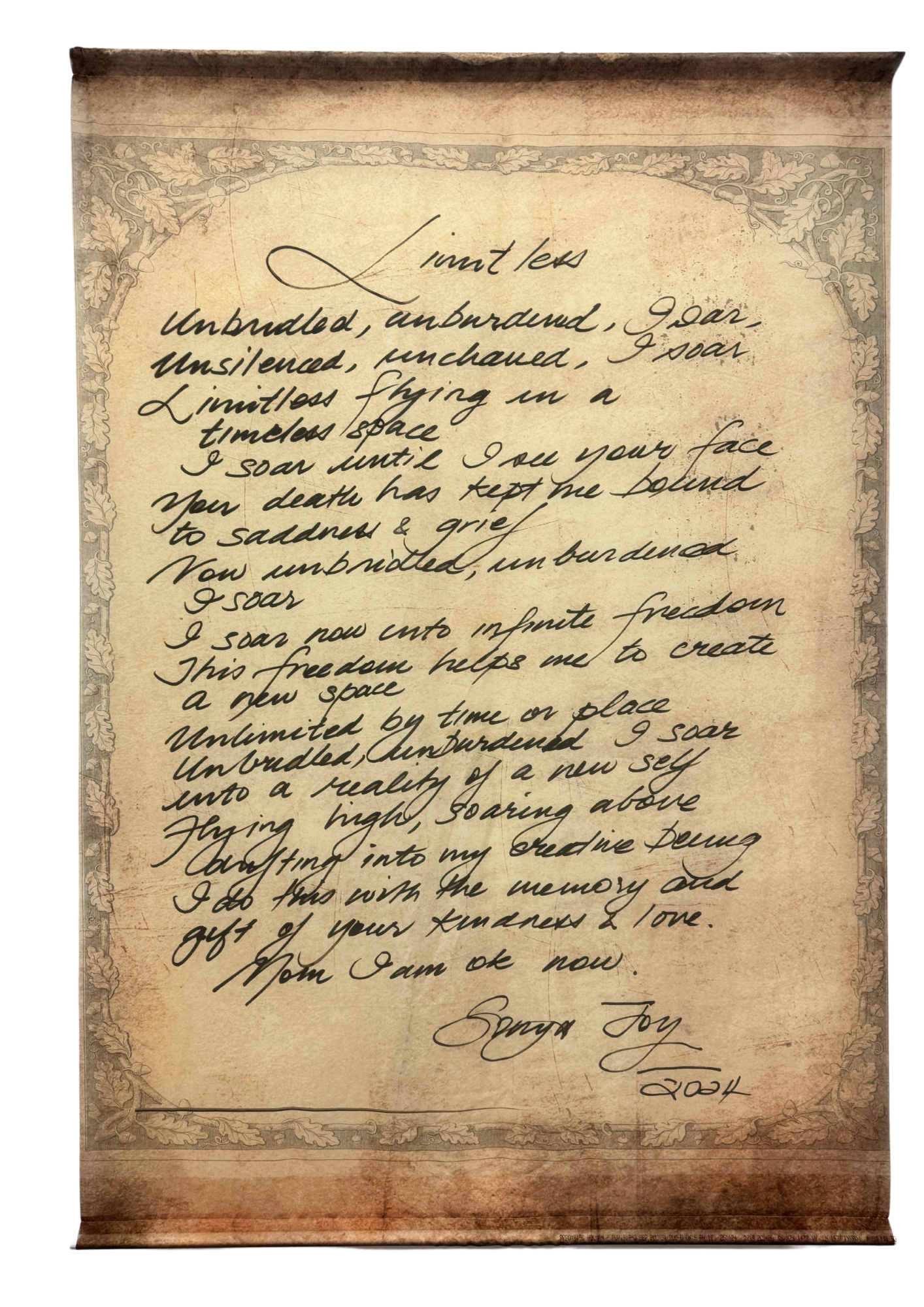 In this artwork, I used handwriting to express how I felt about certain situations. To help with the flow of my words I used calligraphy pens – black ink on beige vermillion, later printed on silk banners. My motivation for my artwork came primarily from raw, prolonged grief on losing my mother compounded with the complexity of loving a flawed person all my life. My artwork makes me feel inspired, hopeful and free. A gradual release from sorrow that had me trapped in a death spiral of pain, both emotional and physical. My message to audiences is this: Remember to surround yourself with a circle of love and care and people who will walk with you on your journey, even when that journey is alone you never really are alone. With me walk my family, my Ancestors. My Ancestors built a bridge of hands that stretched far into the Dreaming, the Dreaming of my mother, my grandparents and my brother and sisters.’