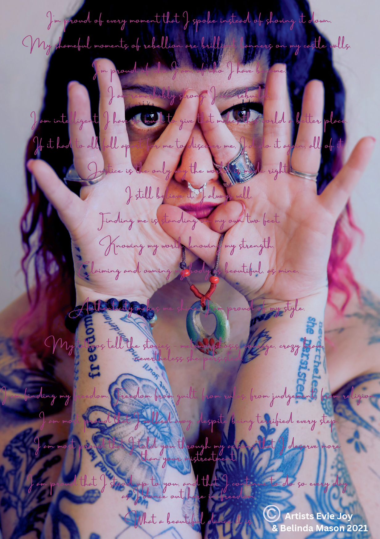 The image in my artwork captures my eyes, the light that is still inside me despite the darkness I’ve overcome. If you look you can see that I’m wearing my Grandy Joy’s necklace. Today, I carry on my grandmother’s legacy for all who didn’t get the chance to live the freedom I have fought with every ounce of my strength to grasp. My poem bears witness to the women who have fought for me to have the freedom I have today. Each generation of us builds a better, safer future for women by the choices we make and the work we do breaking this cycle. My tattoos tell my story of finding liberation, and beginning to flourish. My bright hair expresses me. Bold, blunt, bright, individual. I stand out from the crowd. I love to party and to dance. I laugh super loudly. I love people. I’m a social butterfly. A lot of people have tried to bury me but I’m still here. I just grow stronger through it all.