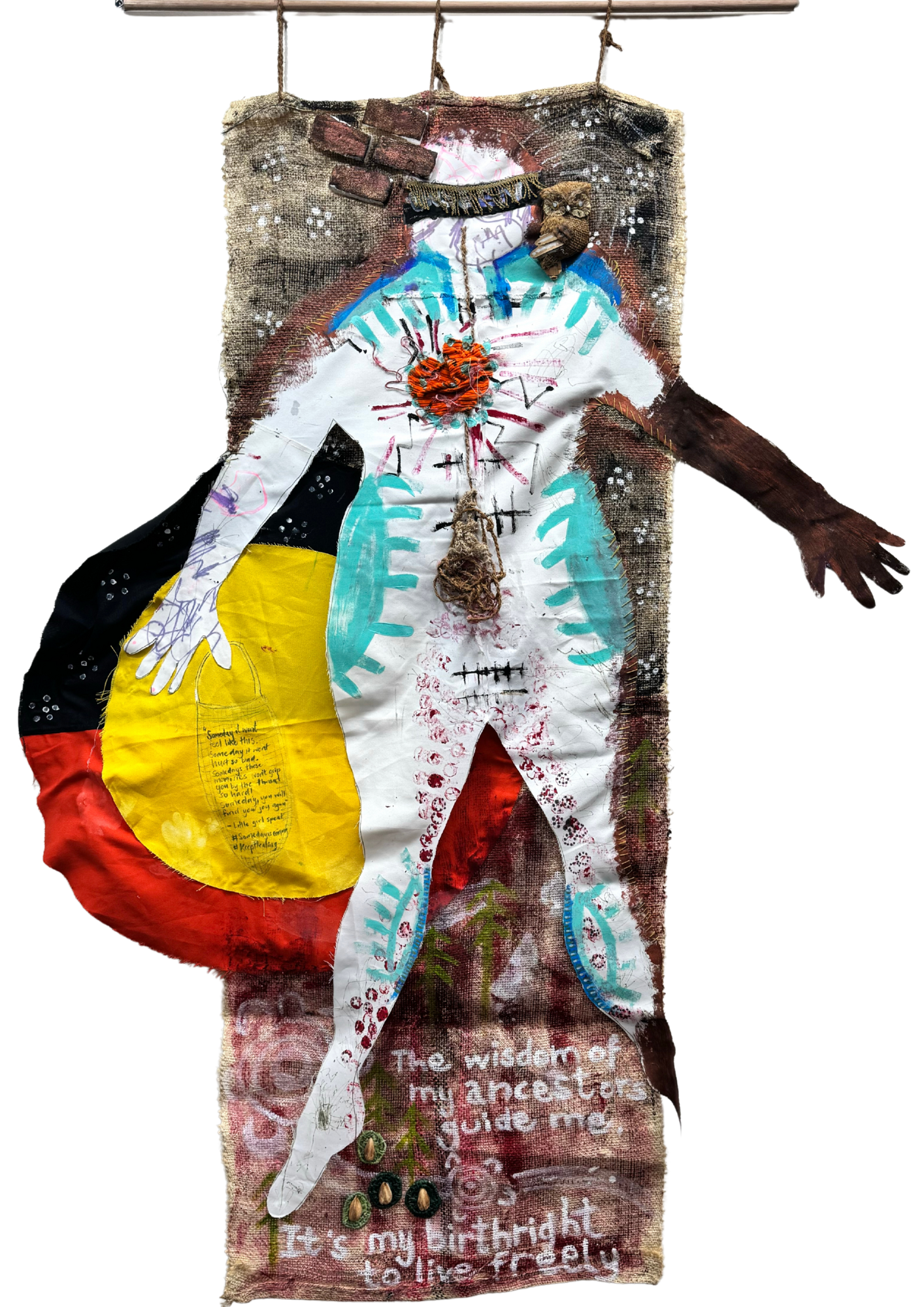 ‘My body map is a visual representation of trauma I faced through family and domestic violence and homelessness. This particular body map portrays my belief in self and my culture that has got me through these unbearable experiences as a child, woman and mother. I attempted to portray both the physical and psychological pain of my experiences, both as an Artist and Therapeutic Arts Practitioner. I know how art helps people share their story and start their healing journey. It was important to me that my artwork had symbols and colours of cultural significance that give me strength, including the owl, which is my totem. Please look at my artwork from the head to toe as I will attempt to explain to you what each piece means…